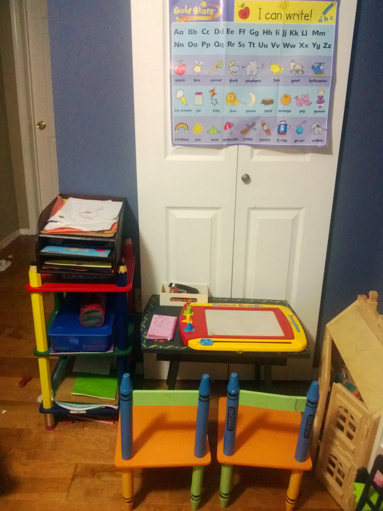 Writing table. We also have a pot of pens and pencils and scissors downstairs. Glue sticks, paper etc are in a kitchen cupboard.