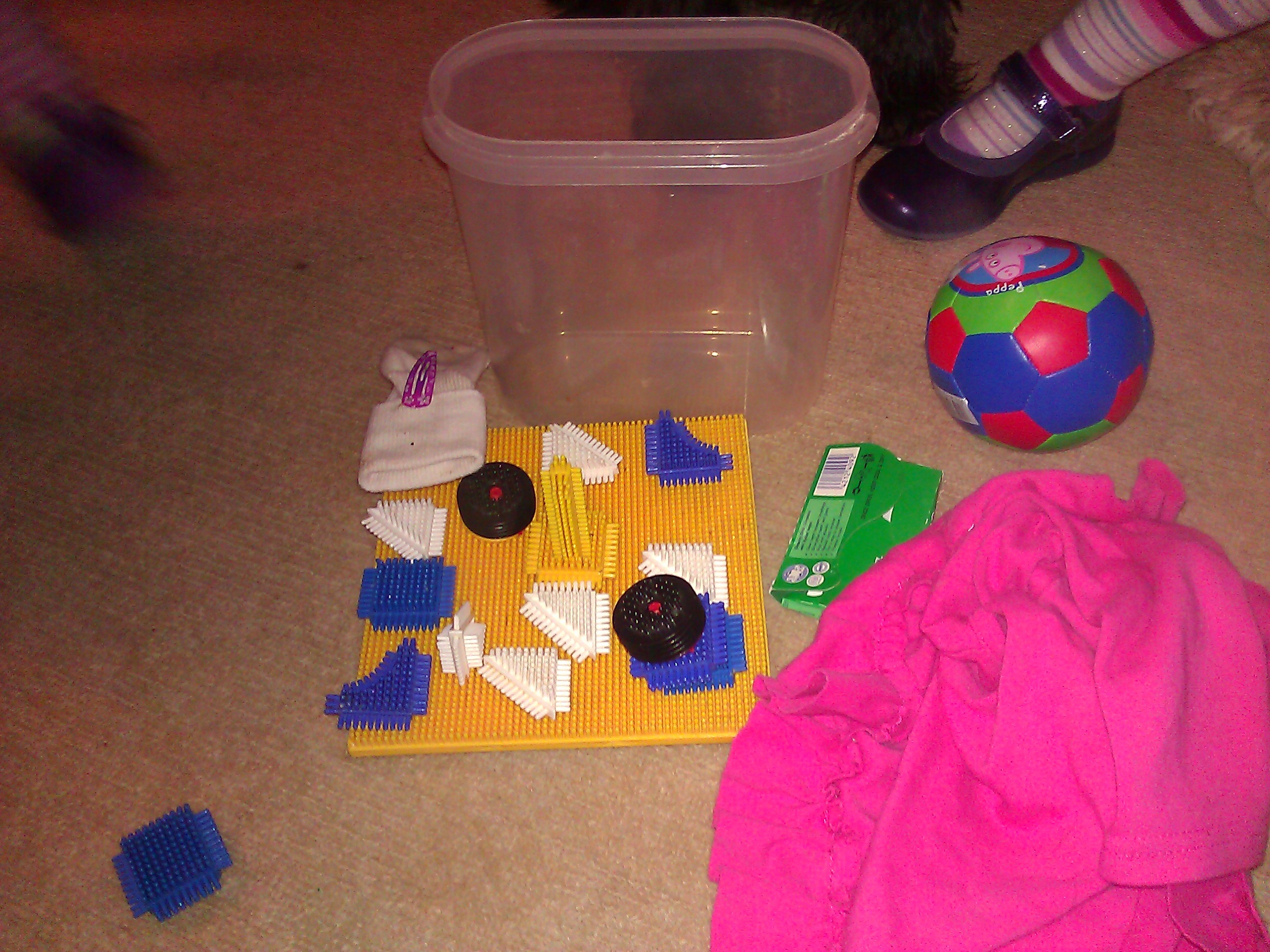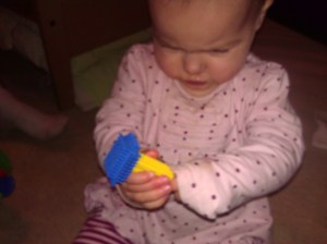 My one year old was happy with just 2 Stickle Bricks, handing it to me to push together and then concentrating hard on pulling it apart. A repetitive game that kept her occupied for a good 10 minutes.