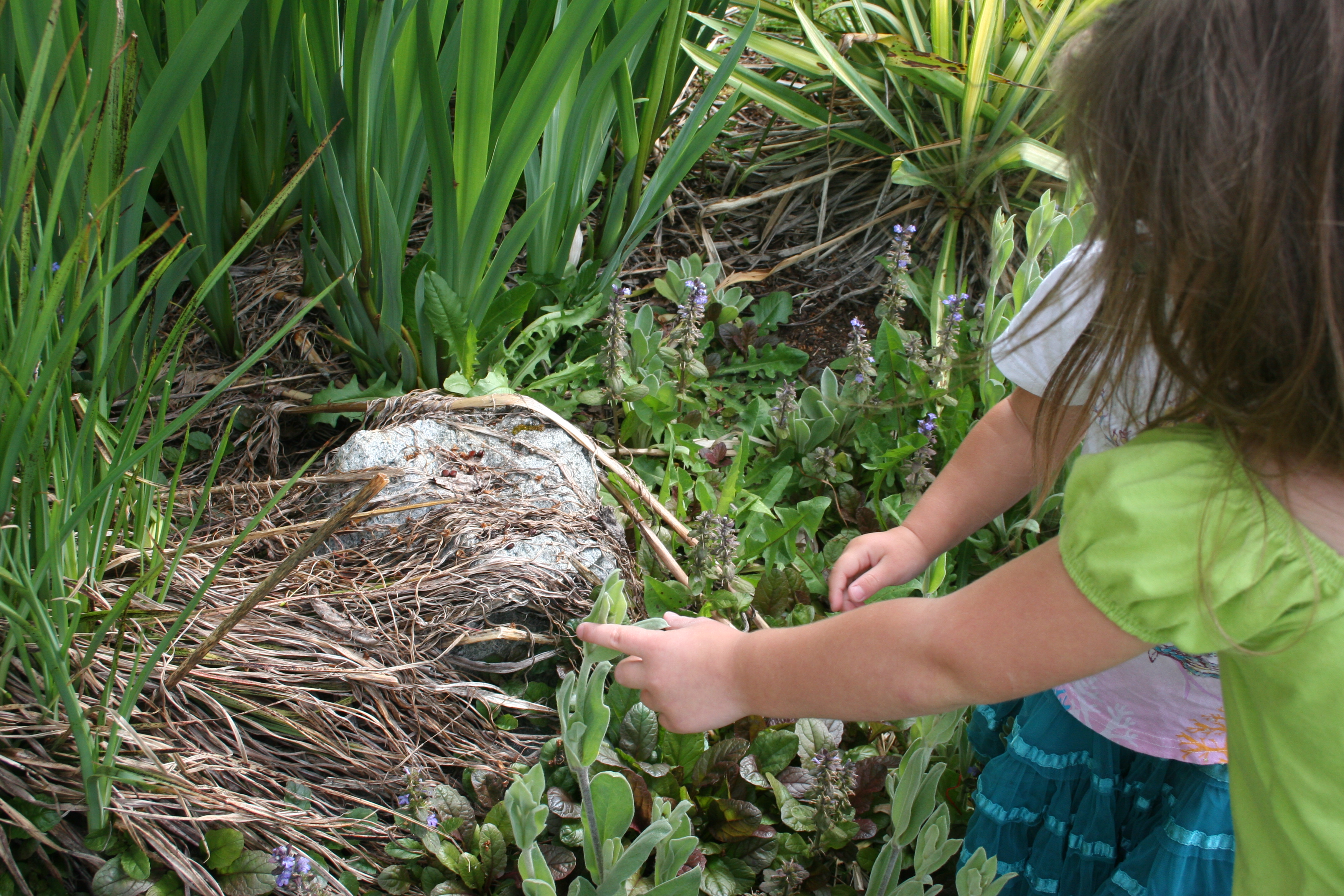 Children are investigating the flower border, stroking the leaves and finding bugs.