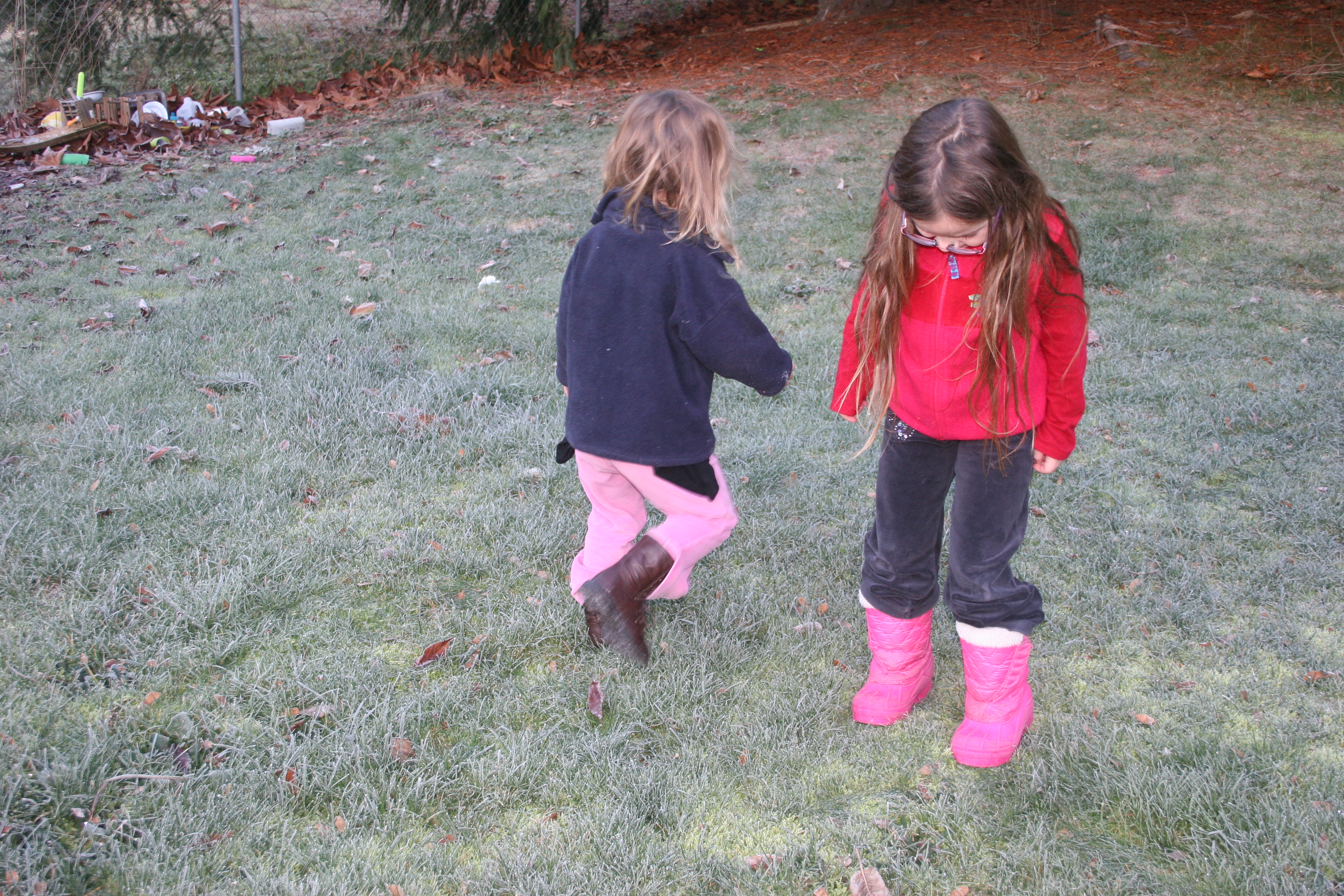 Cool, the grass is covered in frost. Let’s stamp in it.
